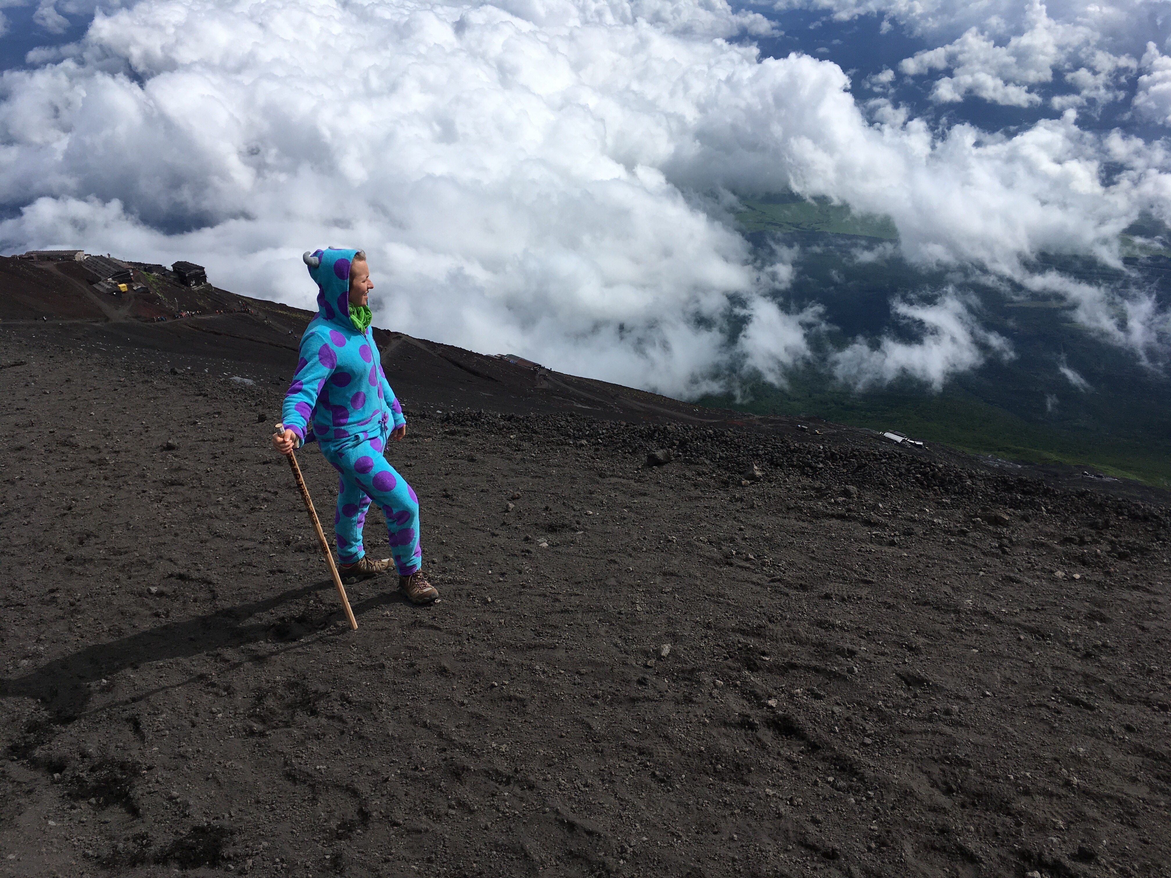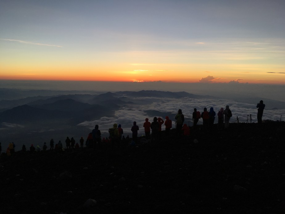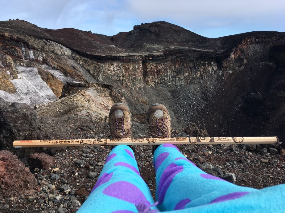 I proudly sported the warmest piece of clothing I still had with me in Japan.  I didn’t wear it the whole way, as it was my final and top layer in my clothing schedule.  However, once I put it on, I brightened a lot of people’s days (even before the sunrise).  A few workers gave me specific compliments on it, declaring it cute in English and Japanese.  On our descent, a small group asked to take photos with me.  (I had been tackling the last bit of the mountain with them, rushing to meet the sunrise, and it was almost a sort of team effort, even though we weren’t actually doing anything to help one another, aside from hurrying up and climbing around the slow people.)