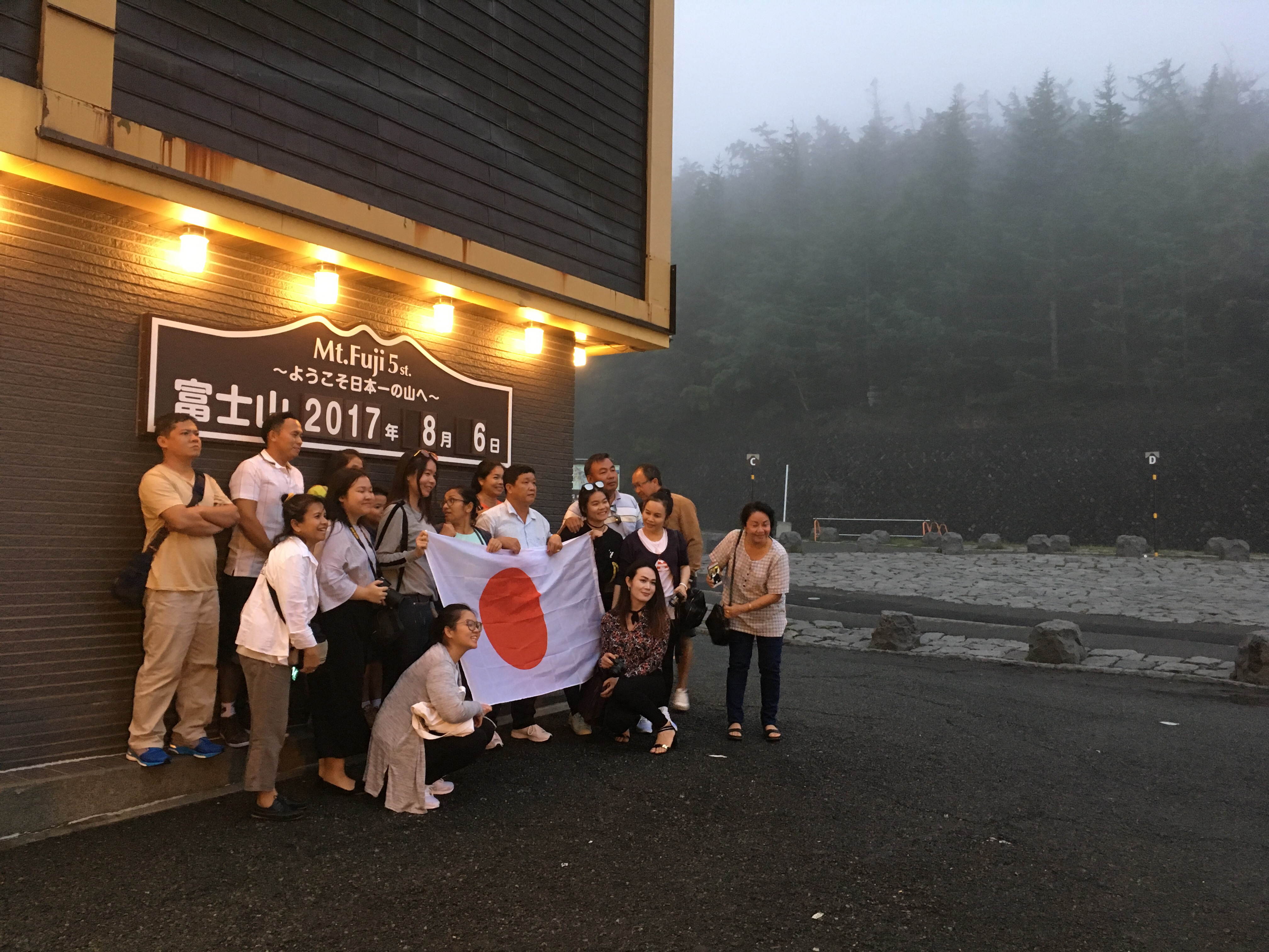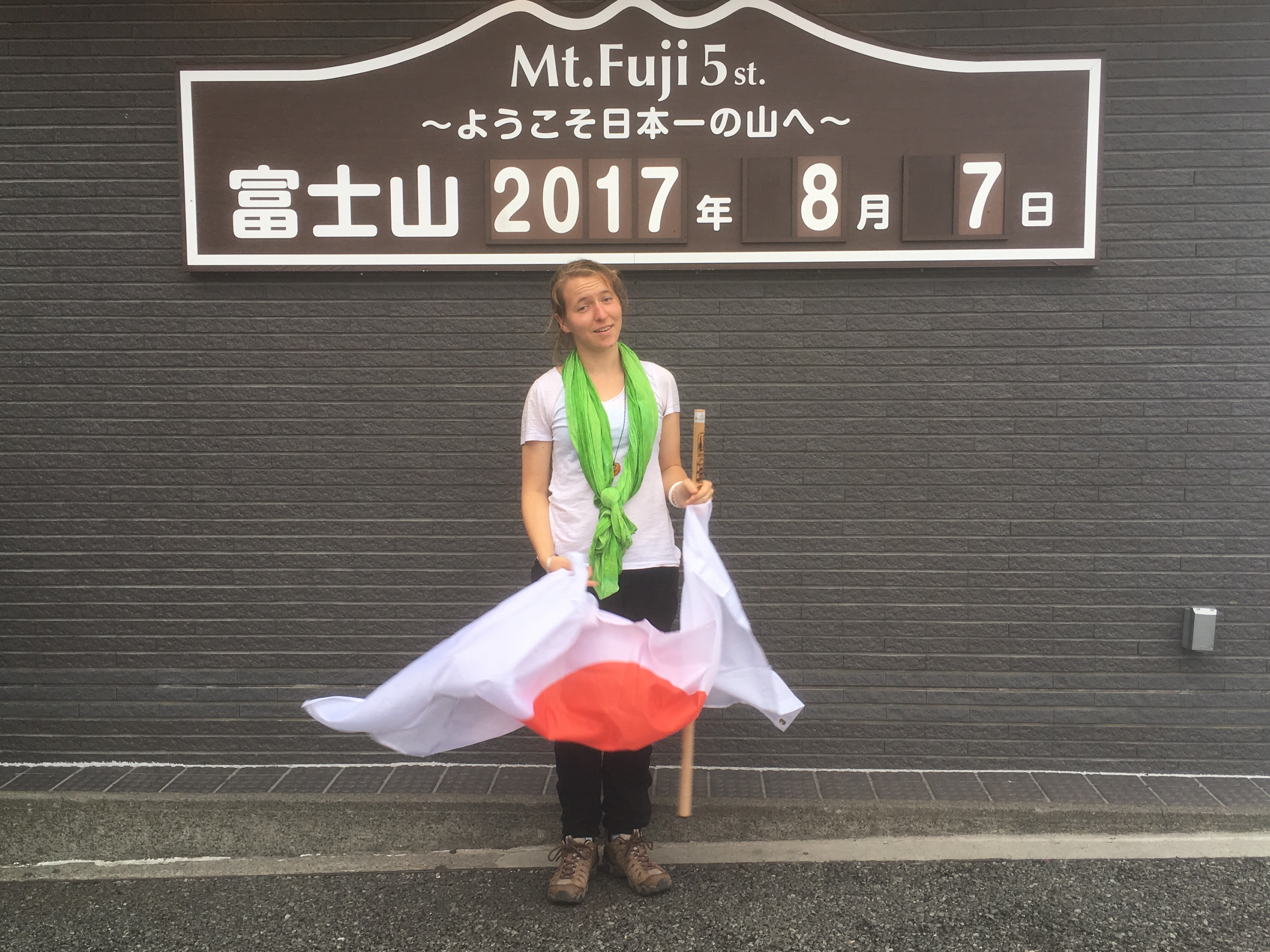 After lunch, I got my photo with my Japanese flag.  Before we began our hike, as we were hanging out at the 5th station and had just met Alex, someone asked him to borrow his hiking stick.  He’d purchased one of the tall ones that had a small Japanese flag and a bell on top of it, and some foreigners wanted to have it in their photo with the Fuji sign.  I then pulled out my actual flag and offered it to them.  They were overjoyed.  About 15 minutes, what seemed like a hundred photos, and many families later, my flag was returned to me by the original delighted family.