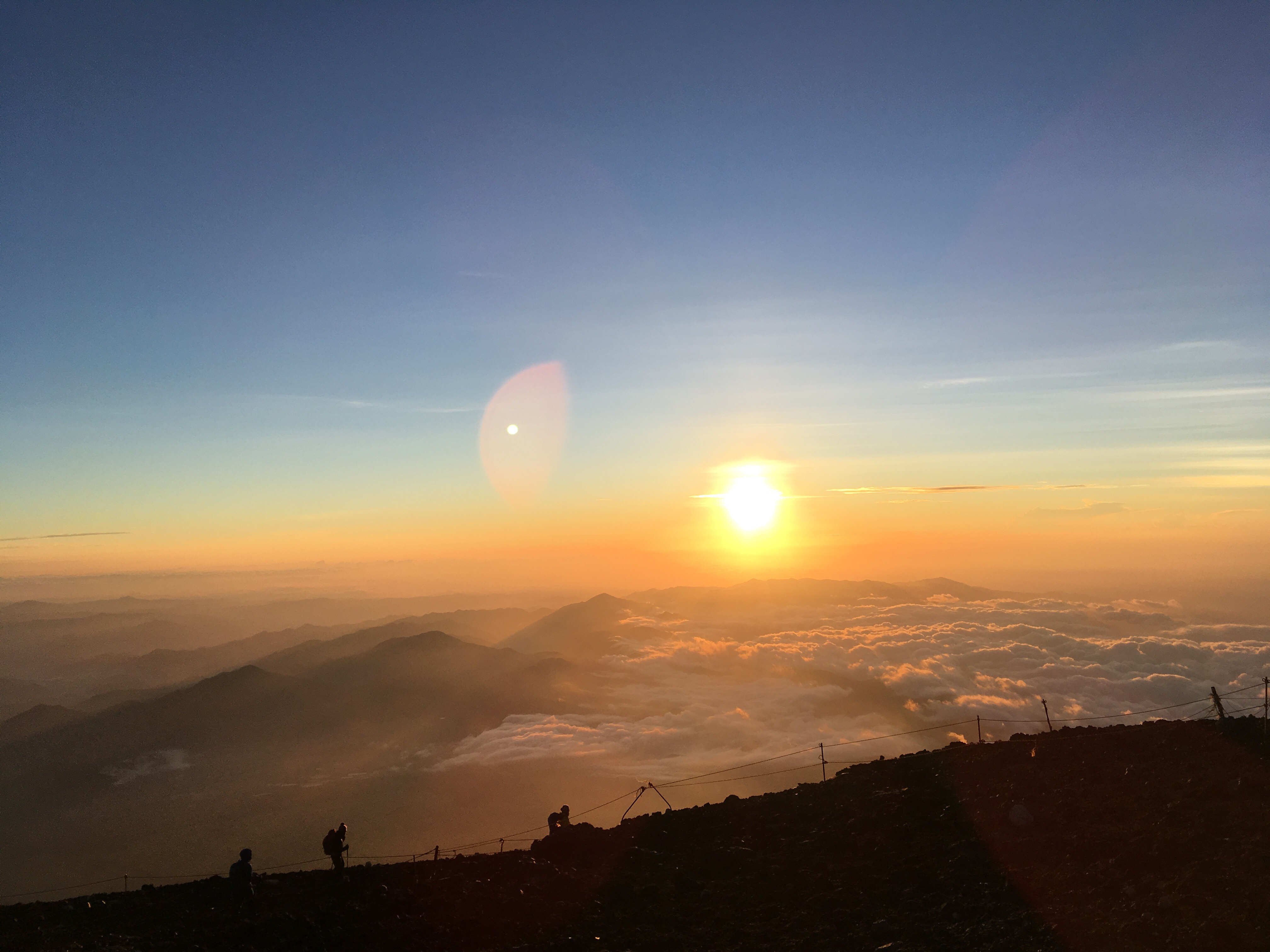 We began just as the rain was ending, shortly after 8pm.  The air was crisp and cool and required a jacket while standing still.  Once we began hiking, though, the jackets soon came off, and we embraced the beautiful, cool night.  And it truly was beautiful.  Down below us – for we began at the 5th station, which was already above some clouds – were various thunderstorms taking place.  The red lightning was beautiful to watch from above and from a distance.  It was like a living, moving painting, it seemed so unreal and so beautiful.  The moon was bright enough, we didn’t even need to use our headlamps (and so didn’t).