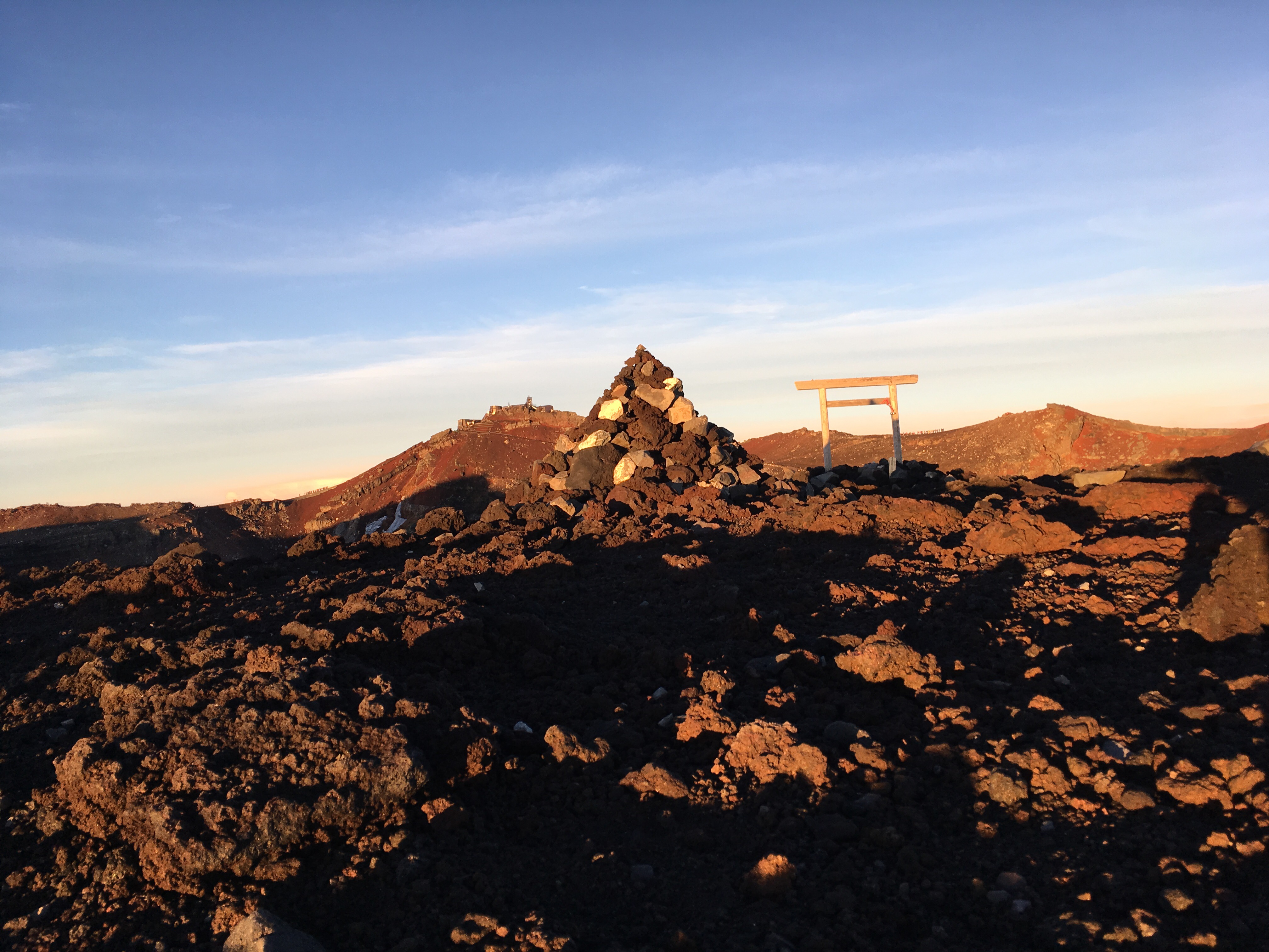 However, in my cozy spot, the wind was slight enough that I don’t even remember thinking anything about it.  I took a photo with my cool hiking stick, which now had all of its stamps (well, all the ones it was going to get – I hadn’t known that certain stations even had stamps at the beginning, so I didn’t have any of the really low stamps, aside from the 5th station, which was where I bought the stick), because I figured it to be the best place for such a photo.