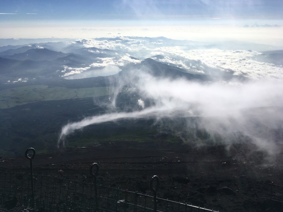 At the top, I mailed two post cards – one to my mother and one to my post card pal in Ottawa (crazy coincidence, right?) – and then used the bathroom, and went and sat on the rim of the volcano that is Fuji-san.  (Some other things happened before all of this, but I don’t much care to share about any of it right now.)  I’m not entirely sure I was supposed to do that, but I didn’t care.  I was tired and needed to sit down and eat something.  Japanese food generally just makes me sick, so I figured it wouldn’t be good to have Japanese food with Casey and Alex when they ate at the little restaurant-esque place after sunrise.