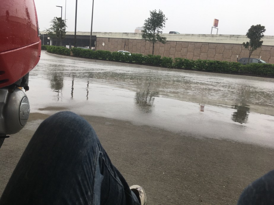 Followed, finally, by a release in the rain that allows you to resume being soaked by it, but that is safe enough for driving again, and so you head home super cautiously, get super soaked, and arrive he to blue skies and no rain, because the clouds have pushed through so quickly, but flooded street sides and driveways bottoms?