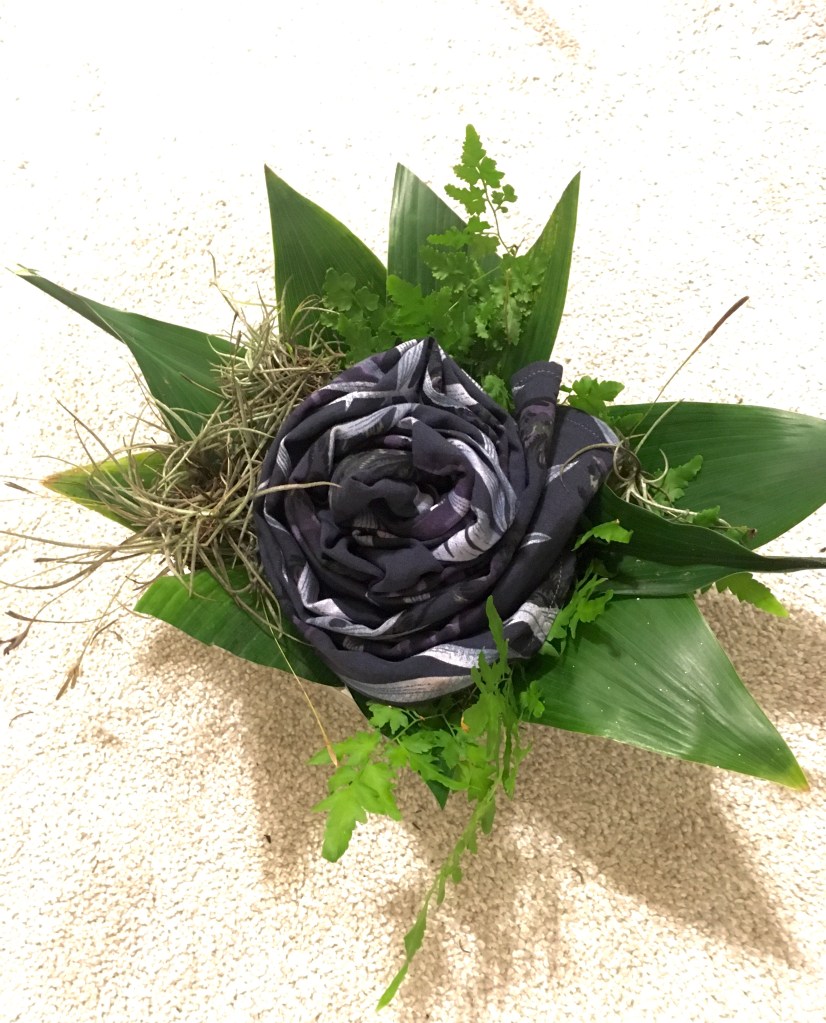 It was successful, by the way, the gift. When I presented it to him, he didn’t fully understand. It just looked like an odd, artsy, plant-y presentation of a rose-shaped folded piece of fabric. After the distractions of other sudden comments and conversations from passers-by departed, he finally continued opening up the rose-folded fabric… One guy commented enthusiastically, “It’s a scarf!” at which point I realized that no one had any idea what it actually was yet, and he needed to unfold it all the way. Finally, he got there, and he discovered that it was a Hawaiian shirt! And it was a very nice and pretty and purple Hawaiian shirt. He was delighted, huge smile and hug and everything. He showed it almost immediately to his friends, and they went wild, cheering. As I had said, he’d needed a Hawaiian shirt. 😛 Even though he enjoyed it greatly, he commented at one point that he thought his friends might be even more excited about it than he was – a major compliment on the present. I was thrilled and grateful that it had played out so well. My mom had done the folding and presentation setup of the shirt, cutting palm fronds and leafy, green things, and picking up moss clumps to put it all together in a beautiful presentation, like a fancy flower on display in a box. (Naturally, I never got a photo of it in good lighting, because I was so excited about gifting it…, but it is what it is, so here is the poorly lit photo I have of the “flower”.)