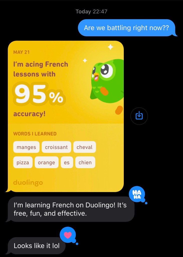 My man and I just unintentionally got into a Duolingo battle to win the family scoreboard for the week, simply by coincidence. We both happened to do a lesson, and also happened to see how the score had changed for the other.