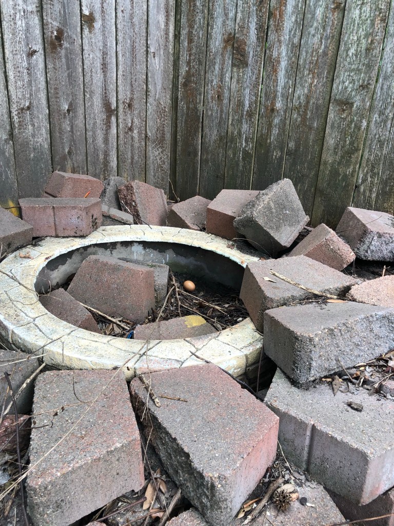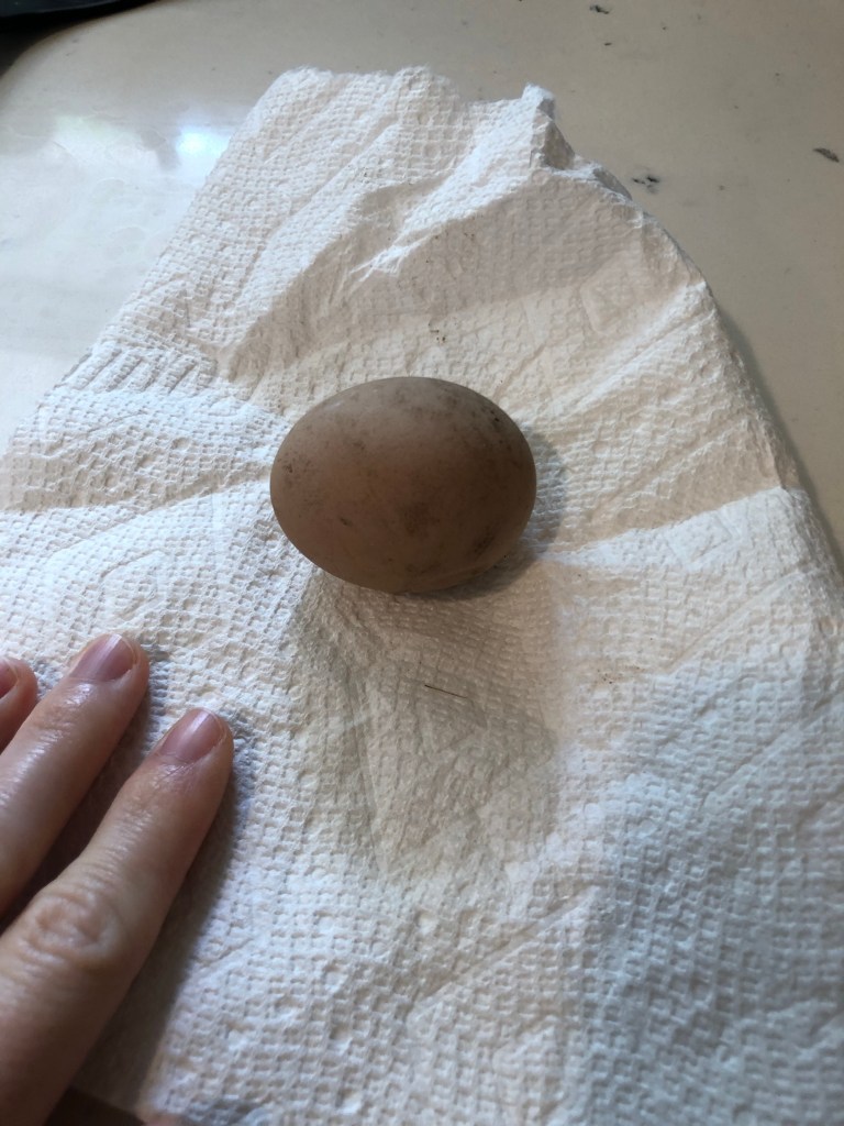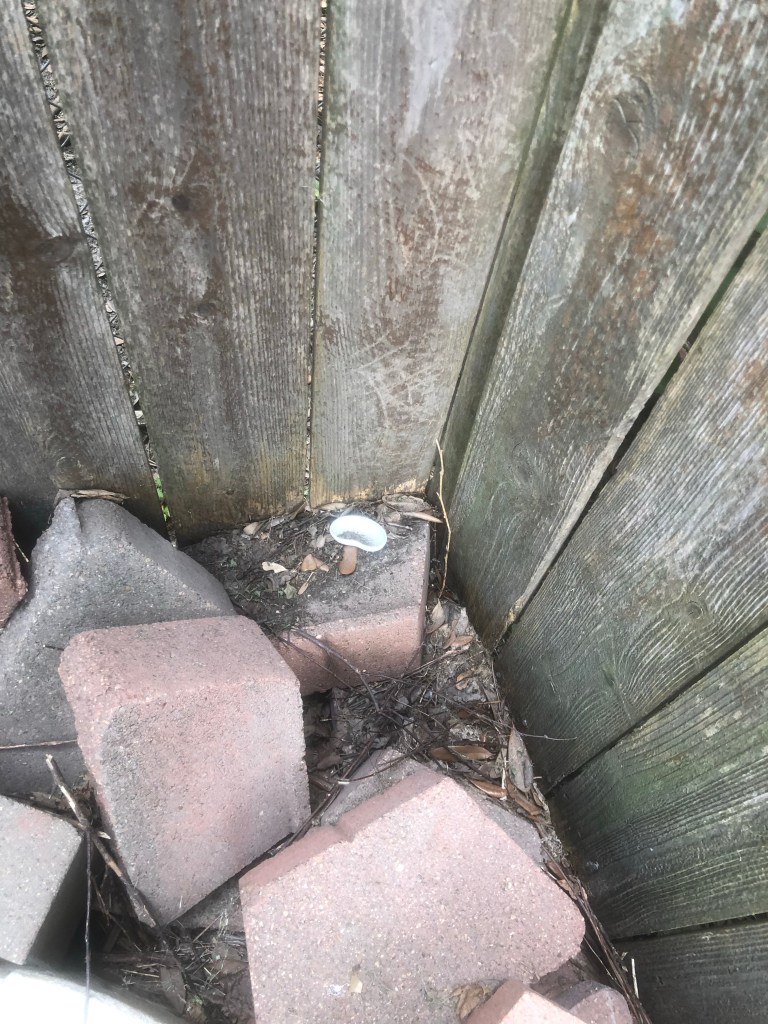 This last one is the one we never found at Easter. I guess a raccoon got it and ate the candy inside… and, possibly, the other half, too?One of the eight possible candidates for the real eggs