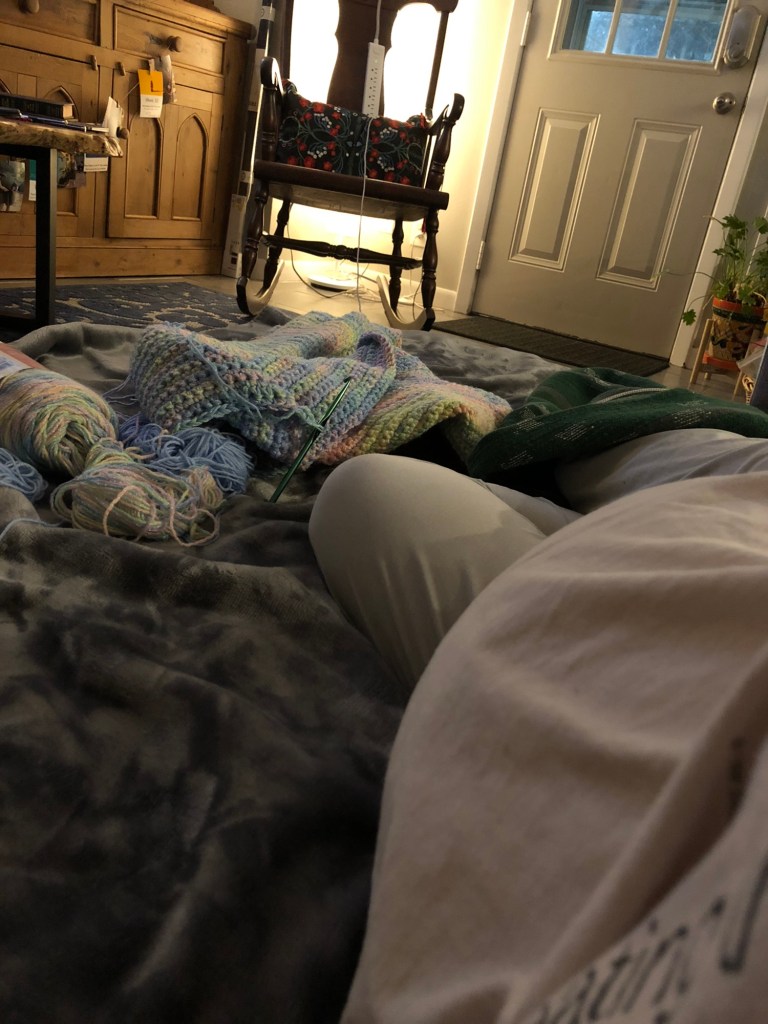 A friend asked me today what I find myself needing more of right now. I wasn’t sure at first. She asked about what I had found that has been able to ground and calm me. I shared that being held by my husband, especially having skin-to-skin contact in any way, has been the most helpful thing lately. I just want to be held and pet like a dog, basically. So, the little bit tonight went a long way. Hopefully, we get to cuddle overnight, too, as that helps the most right now and would be a very positive end to such a day. The day did improve, yes. My husband was even really great when I was just suddenly outright balling while knitting, and I shared with him my experience of guilt around not wanting things the way they were turning out, that is that I wanted what was not God’s will, and I was feeling horrible for it. Lots of shoulds there. I eventually told the devil to leave, and said the name of Jesus three times to calm myself, and it actually helped me feel a weight release off of me. Quite bizarre, to be sure. But, also, my husband reassured me that it’s okay to want something different from God’s will for us. After all, there have been many times I have wanted things to go one way or another, and they didn’t. It was ultimately for the better, but I was sad at the time for not having the desire results. I never, however, felt guilty about having wanted what I had wanted. This situation need not be any different. It’s okay for me to want what I want. I can still learn to love and embrace what does happen, when it happens, whatever it happens to be.