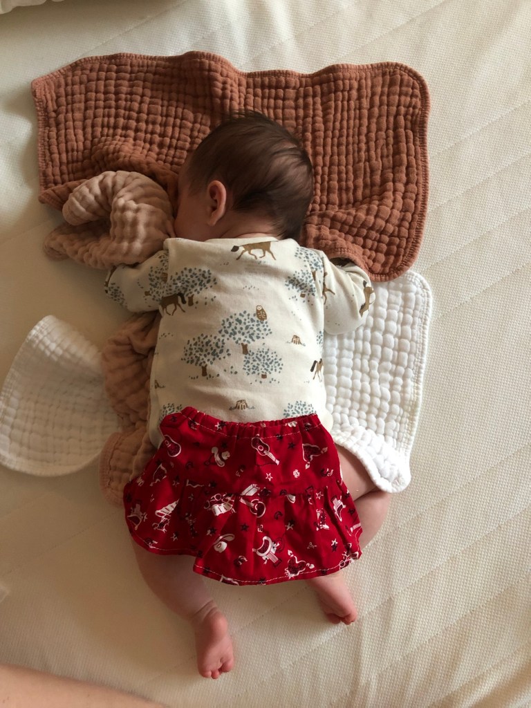 However, when I went through the bag today to take off tags and get everything washed, I went ahead and just set the skirt on our sleeping baby, so we could get a sweet photo of her ‘in’ it. ๐ Notice how small that waist band is compared to her waist. Haha