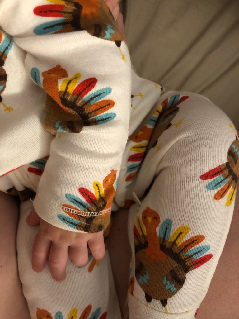 I let my daughter select her pajamas most nights. She just got a good handful of new ones, since she moved up a size in clothing and we realized we only had a few pajamas in the new size. Tonight was her first chance to choose (since there were actual options now). With stellar selection, she opted for the brand new silly turkeys one. My mom and my husband and I all considered whether to get it or not, because it is clearly tied to Thanksgiving and it isn’t exactly feminine or girly. But we all three were just drawn to it – we simply liked it. Clearly, my daughter felt the same way, which is really cool. Haha