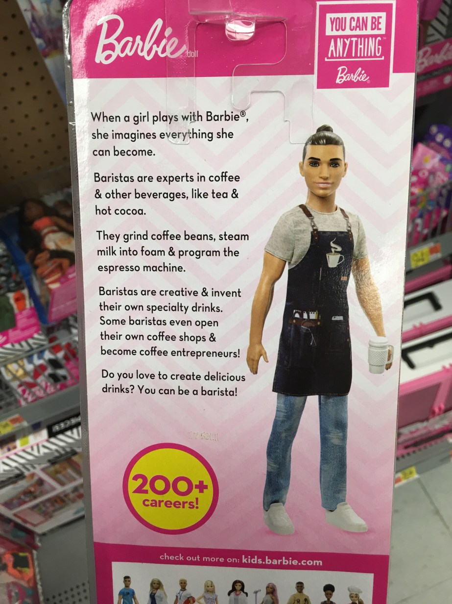 Turns out, there is this whole line of Barbies and Kens that I had never even heard mentioned, let alone seen myself. From hipster baristas with man buns to prosthetic legs to heavier everyday girls, Barbie has released a line of dolls called “You can be anything” Barbies.